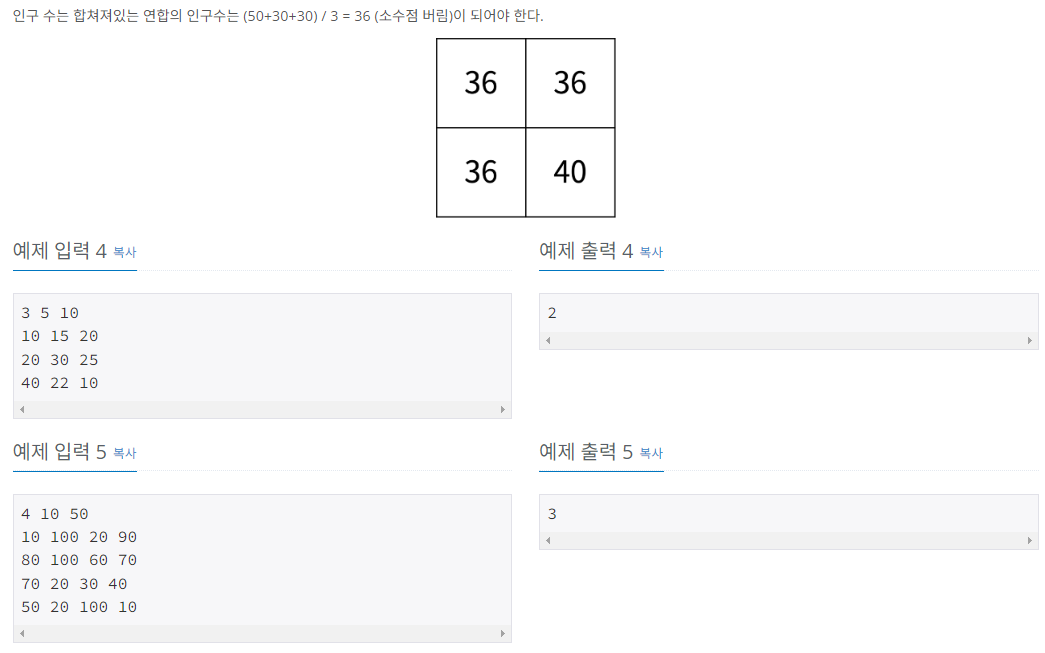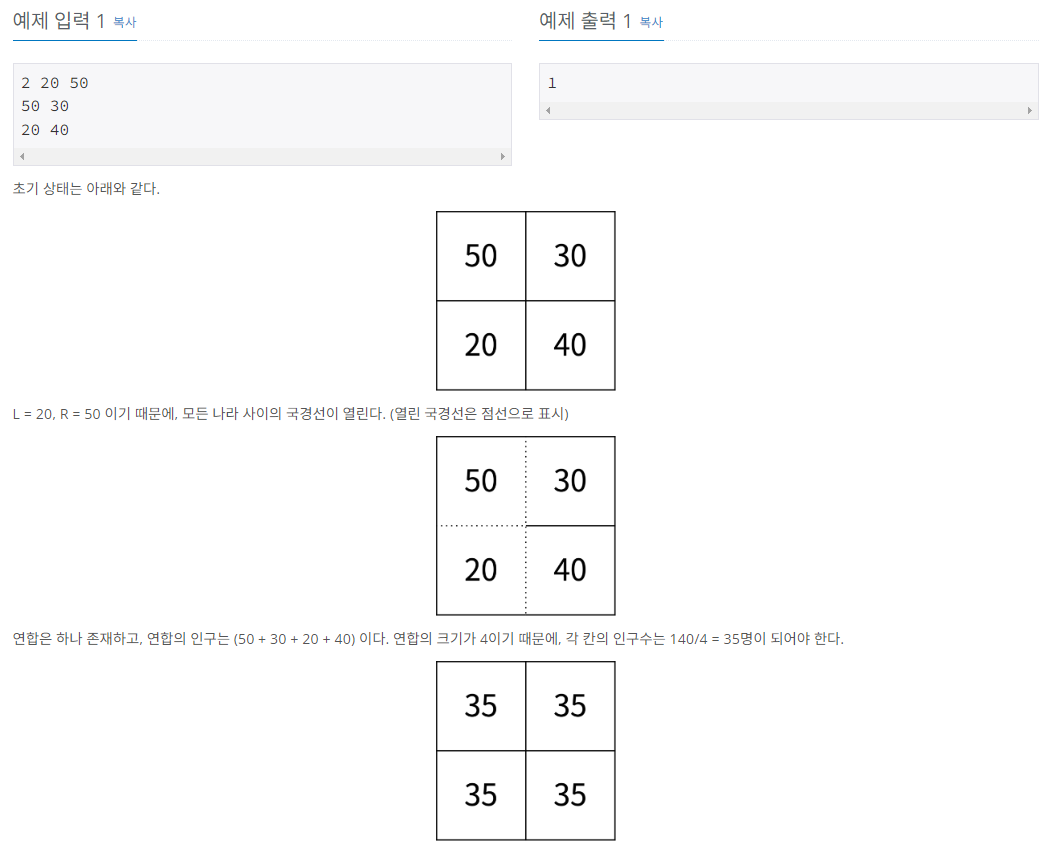 모든 나라의 위치에서 BFS를 수행하여 인접한 나라의 인구수를 확인한 뒤에, 가능하다면 국경선을 열고 인구 이동 처리를 진행한다. visited 배열을 따로 두어 index를 확인하면서 더 이상 인구 이동을 할 수 없을 때까지 반복한다. BFS를 처리할 때 인구 분배를 같이 해나가는게 중요한 것 같다.
