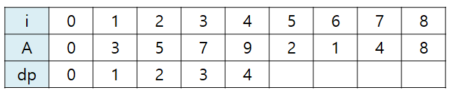 i가 4일 때까지는 수열 A가 오름차순으로 정렬되어 있기 때문에 dp도 1씩 추가해준다.