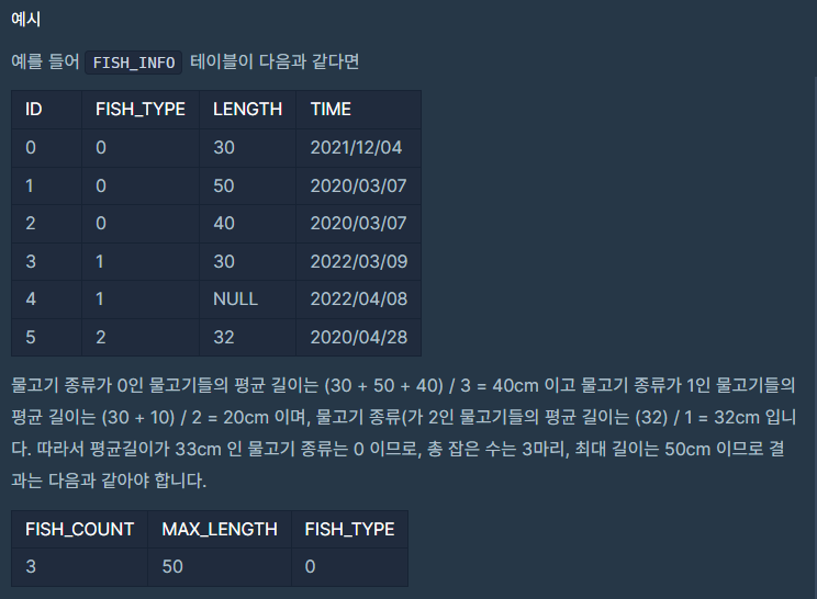 | [SQL] 물고기 종류 별 대어 찾기, GROUP BY, JOIN (0) | 2024.07.10 |