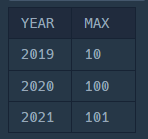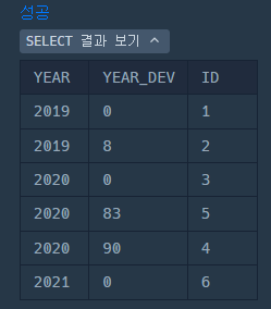출력 시에는 기존 테이블에 있던 데이터를 출력해야 하고, 위의 테이블과 YEAR칼럼 값을 맞춰주기 위해 아래와 같이 필요한 값들로만 테이블을 새로 생성했다.