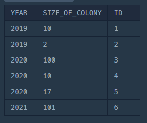 SELECT YEAR(DIFFERENTIATION_DATE) AS YEAR, SIZE_OF_COLONY, ID