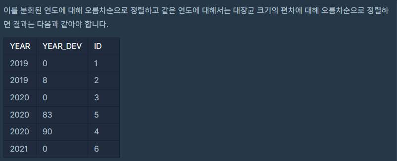 두 테이블을 조인하여 SELECT문에서 편차를 구한 후, ORDER BY절을 통해 분화된 연도에 대해 오름차순으로 정렬하고, 같은 연도에 대해서는 편차별로 오름차순해준다.