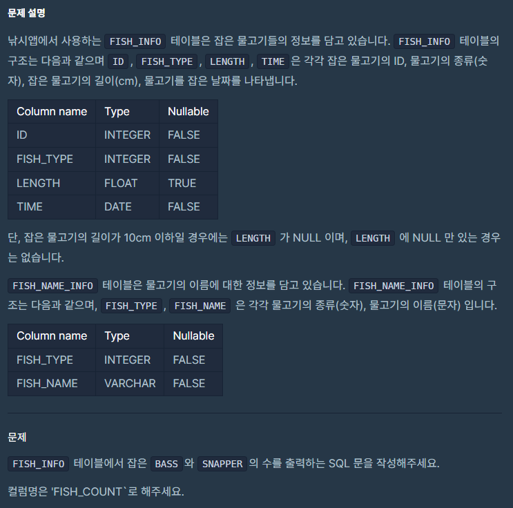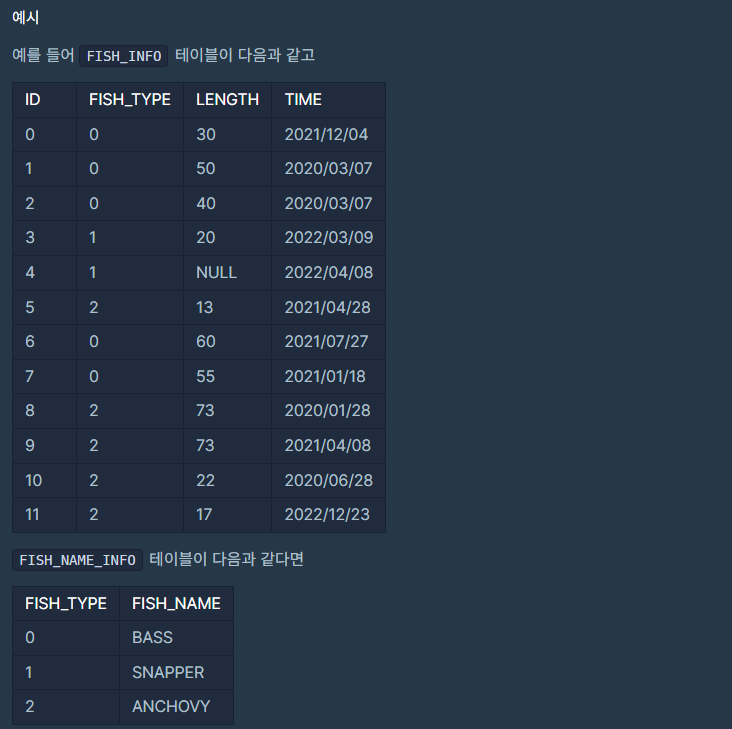이후 FISH_NAME_INFO 테이블과 조인하여 물고기 이름이 BASS와 SNAPPER인 경우를 합하여 출력한다.