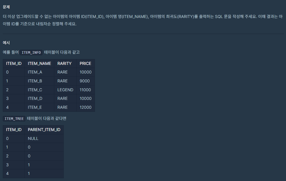 우선 ITEM_TREE 테이블에서 업그레이드가 가능한 ID들을 중복없이 구해야한다. (이때 NULL은 제외시킴)