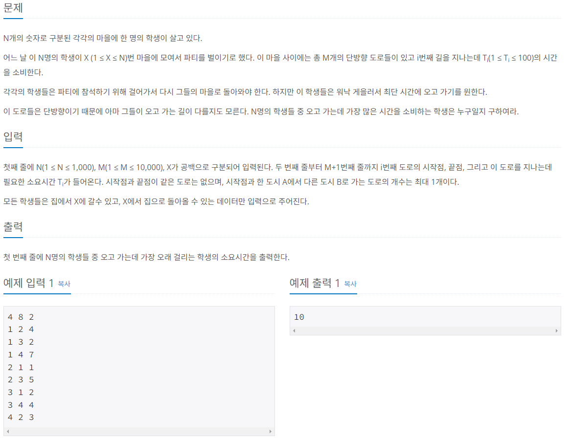 최단경로 문제와 동일한 다익스트라 알고리즘으로 구현한다. 이때, 시작 노드가 고정된 오는 길 뿐만 아니라 가는 길도 계산해야 함으로, 추가해준다.