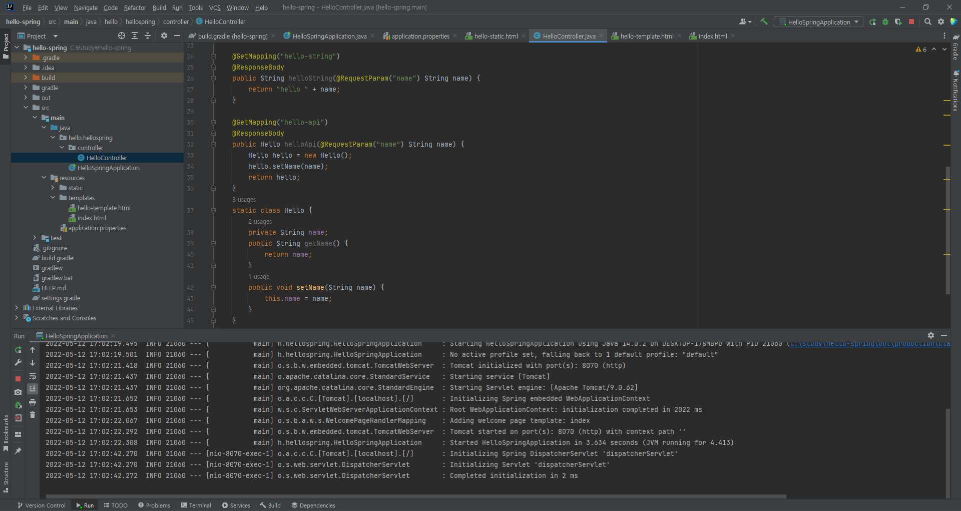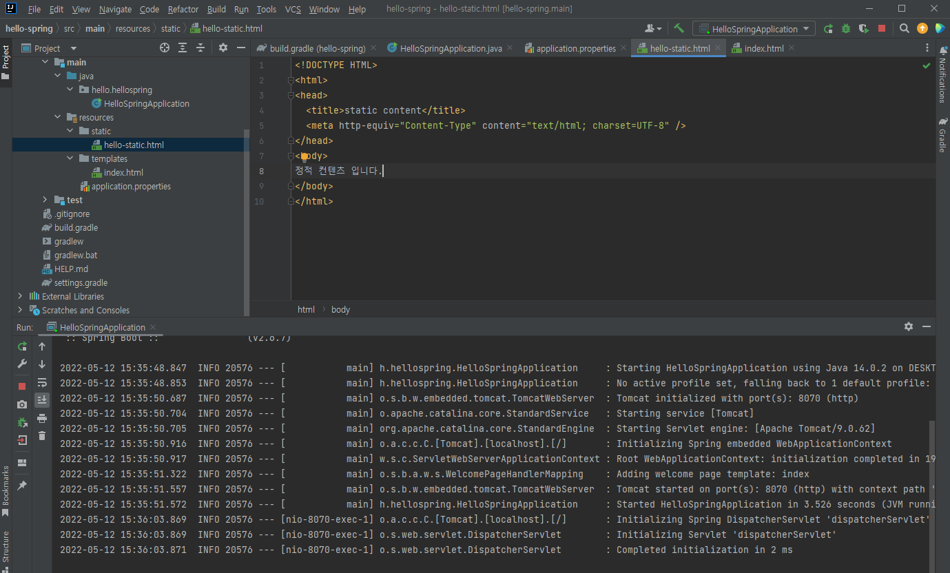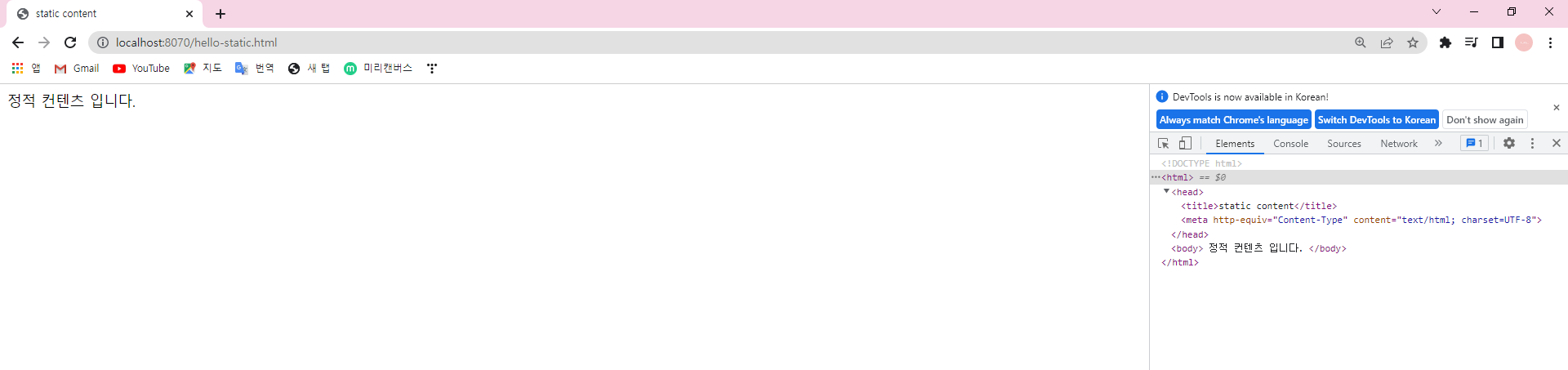 resources->static->hello-static.html 파일을 생성한 후 http://localhost:8070/hello-static.html에서 확인한다.