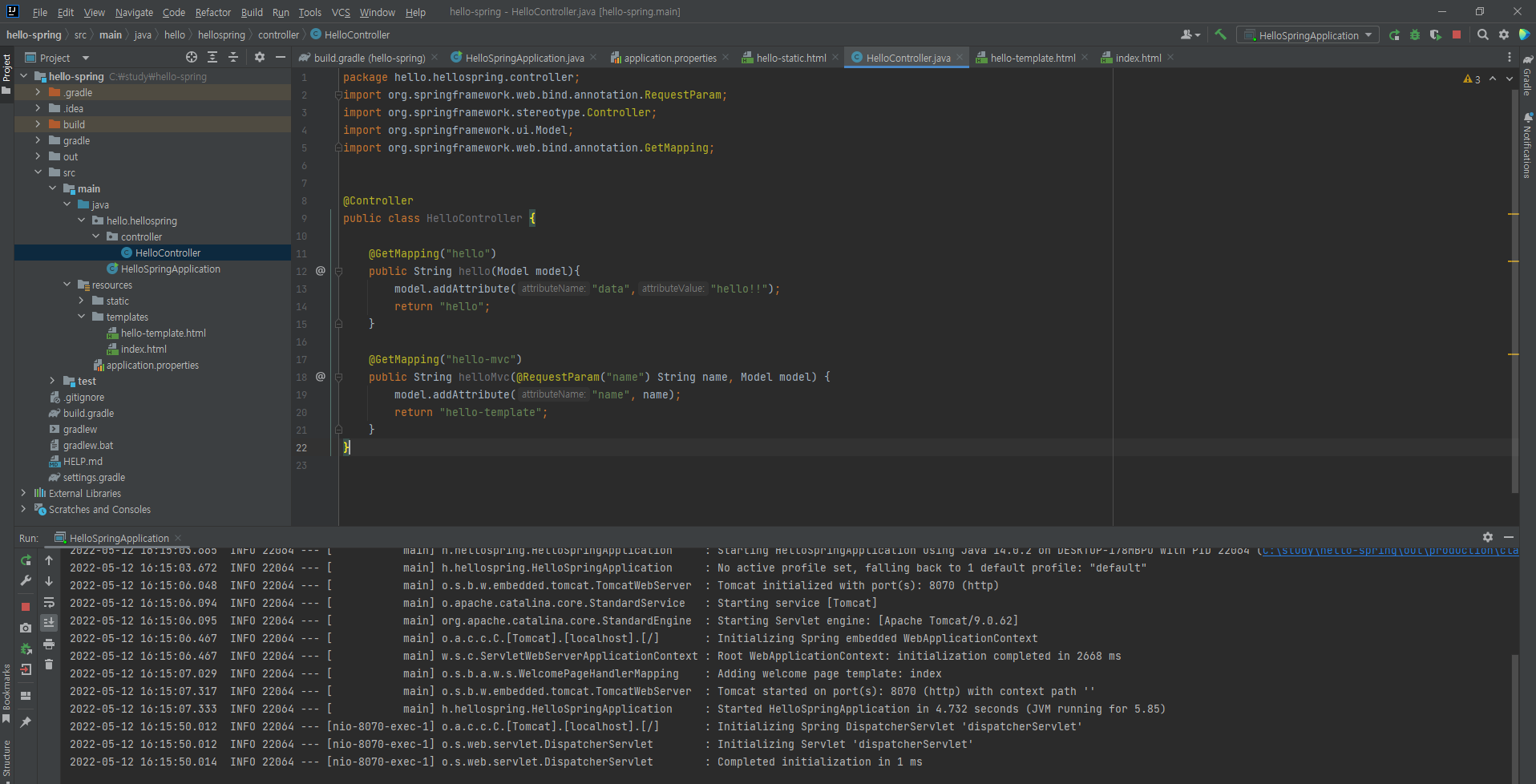 java->hello.hellospring->controller->HelloController 파일에 작성한다.