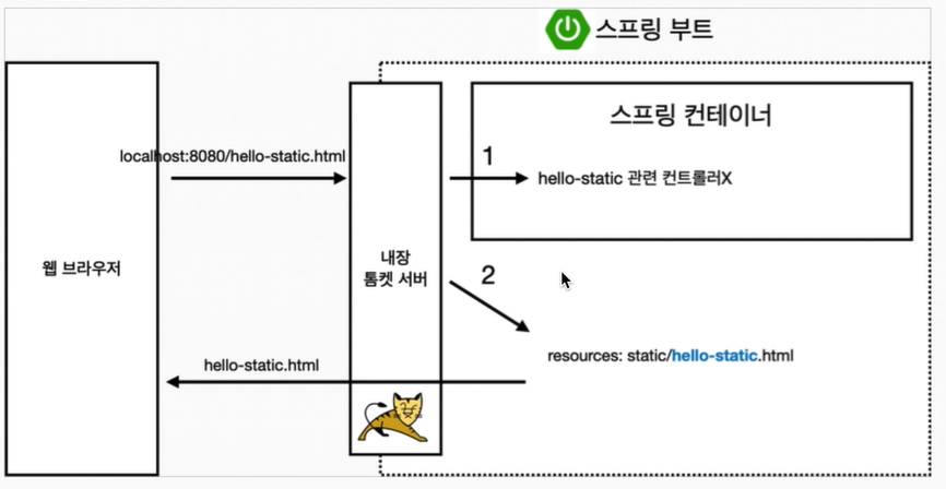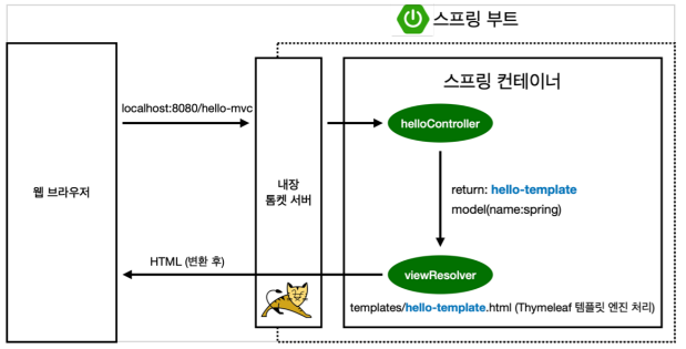1. 웹 브라우저에서 hello-mvc를 넘기면 내장 톰켓 서버를 먼저 거친다.
