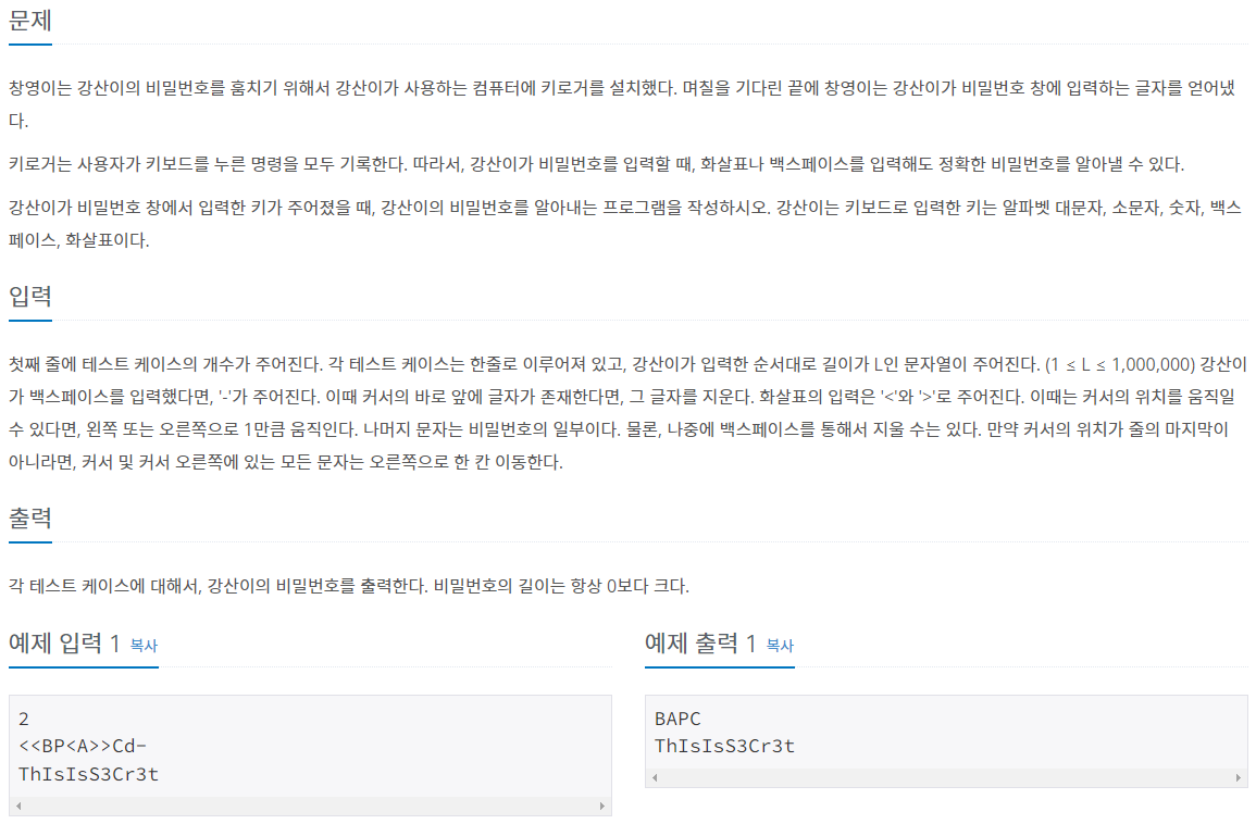 첫째 줄에 테스트 케이스의 개수가 주어진다. 각 테스트 케이스는 한줄로 이루어져 있고, 강산이가 입력한 순서대로 길이가 L인 문자열이 주어진다. (1 ≤ L ≤ 1,000,000) 강산이가 백스페이스를 입