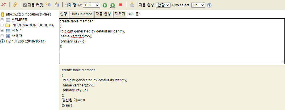 <테이블 생성하기> H2 데이터베이스에 접근해서 member 테이블 생성